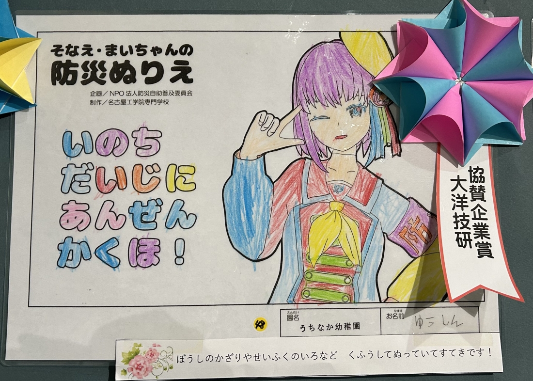 本防災イベントの公式キャラクターの「そないまい」ちゃんのぬり絵大会の表彰式に登壇。