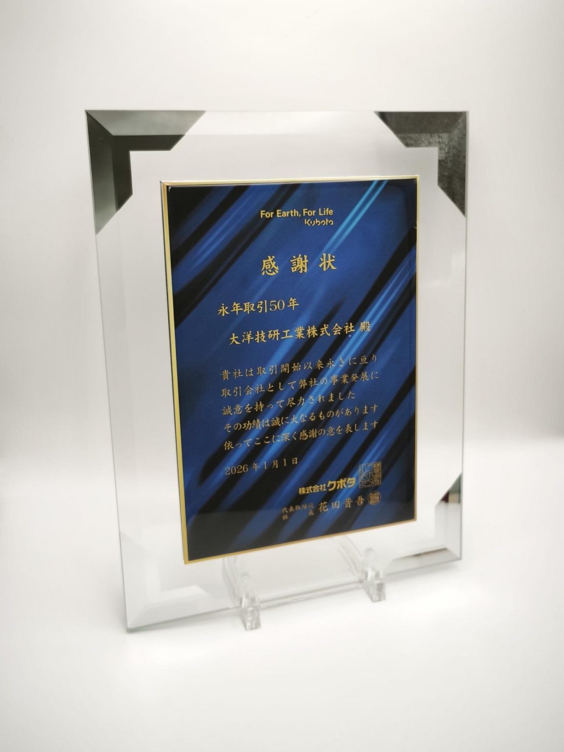 このたび、長年お世話になっている株式会社クボタ様より、 「お取引50年」の表彰をいただきました。 50年という節目を迎えられたことに、改めて感謝の気持ちでいっぱいです。 これまで支えてくださった皆さま、本当にありがとうございます。
